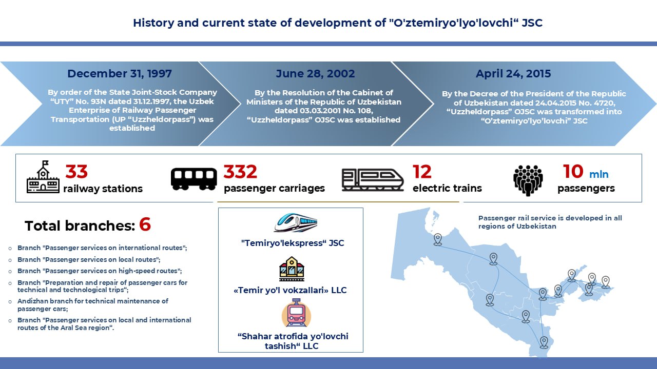 "O'ztemiryo'lyo'lovchi" JSC is an important part of the railway system of Uzbekistan. Since its foundation in 2002, the company has focused on improving travel conditions, increasing the level of service and creating infrastructure that meets international standards.