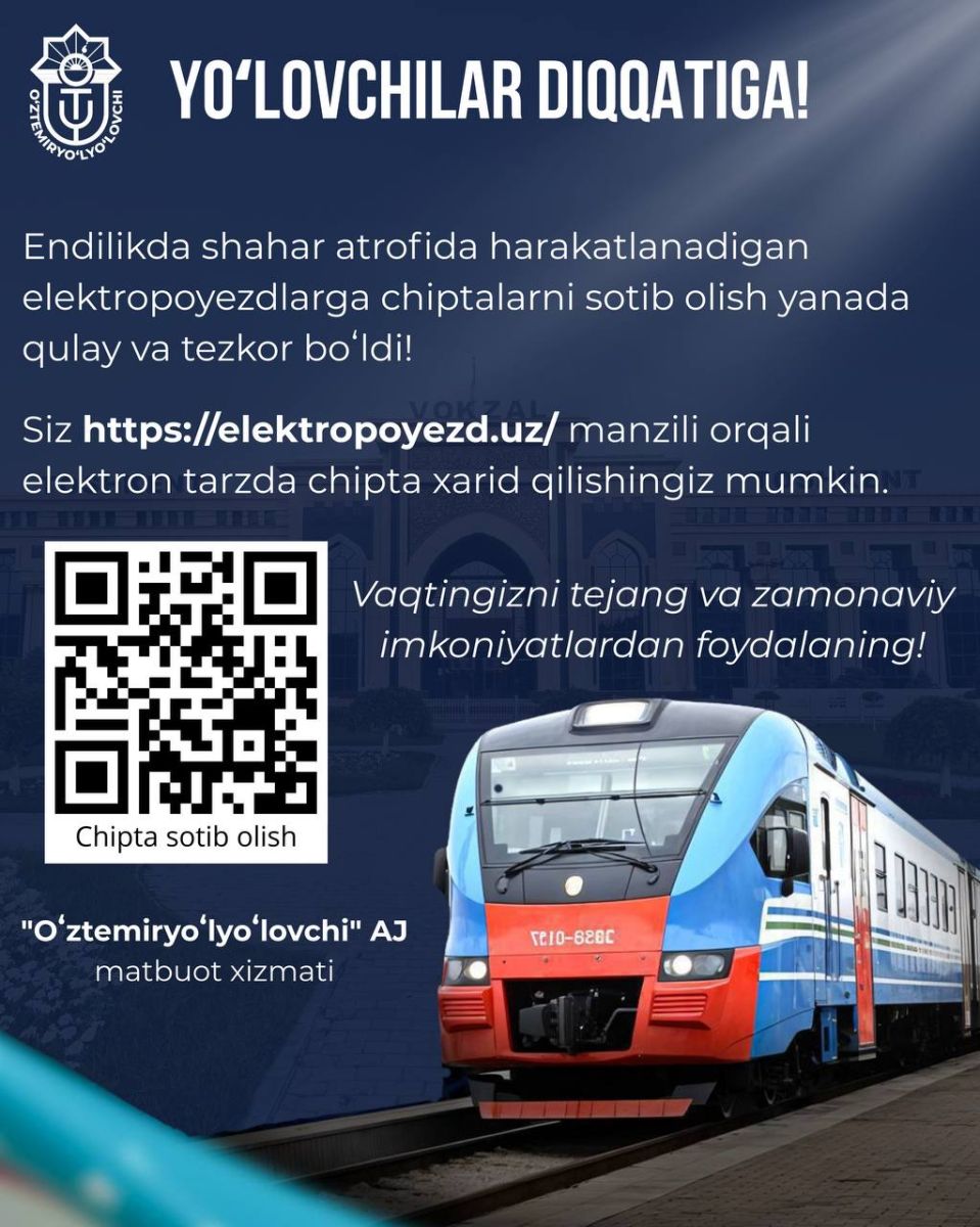 ❗️ Eslatib o‘tamiz, elektron chipta xarid qilgan yo‘lovchilar poyezdda poyezd kuzatuvchisiga chiptani elektron ko‘rinishda taqdim etishlari kerak boʻladi!