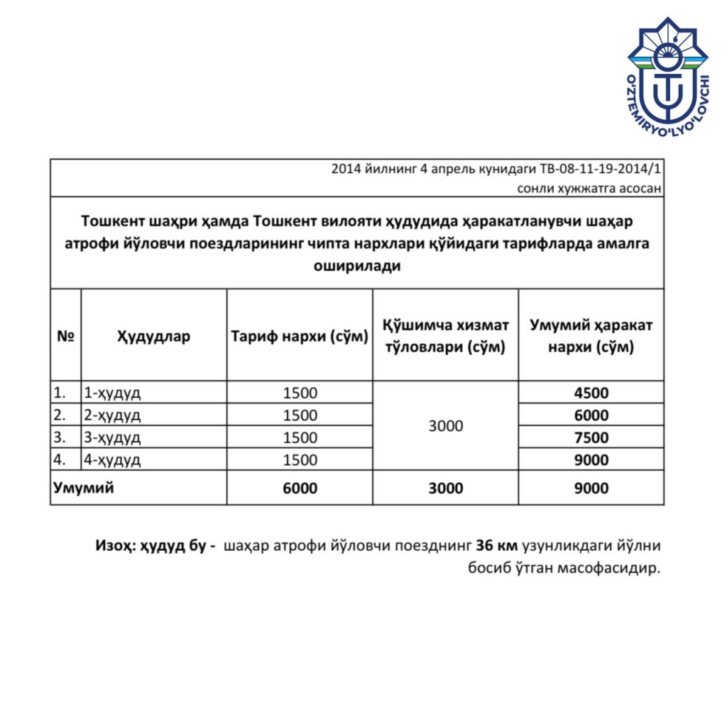 Цены на проезд в пригородных пассажирских поездах АО “O‘ztemiryo‘lyo‘lovchi”