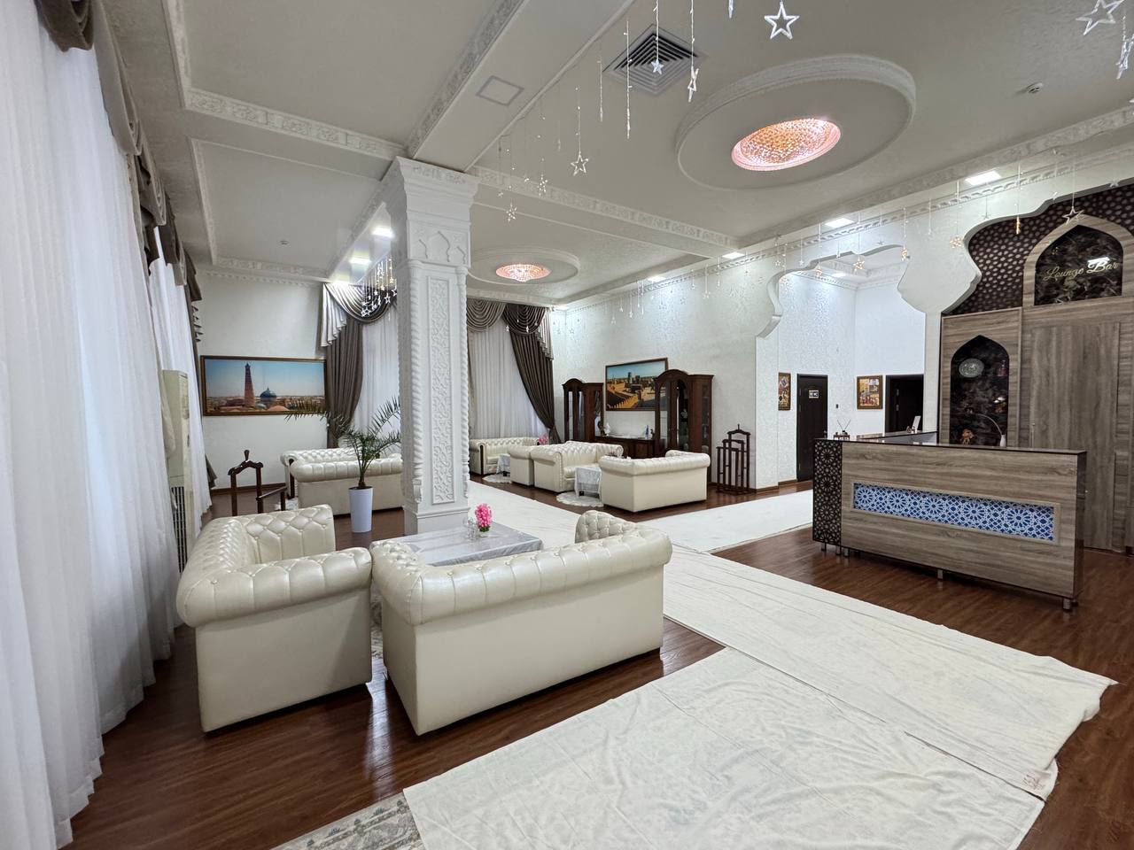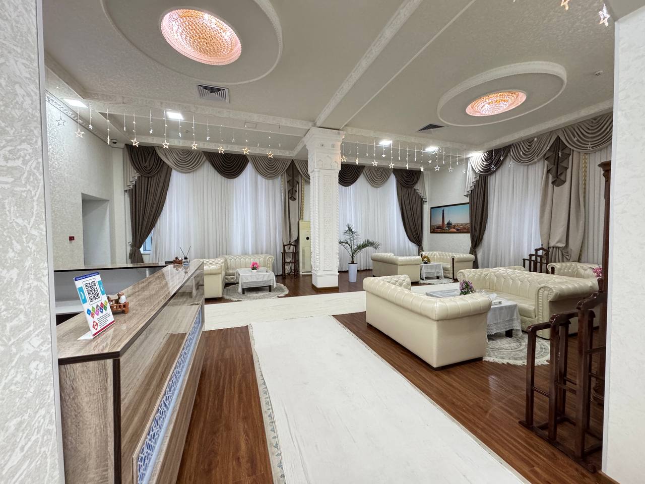 Интерьер: Величественные белые колонны с национальной резьбой (ганч), высокие потолки с многоуровневым освещением и декоративные элементы в виде восточных арок. Стены украшены картинами с видами древней Ичань-Калы.